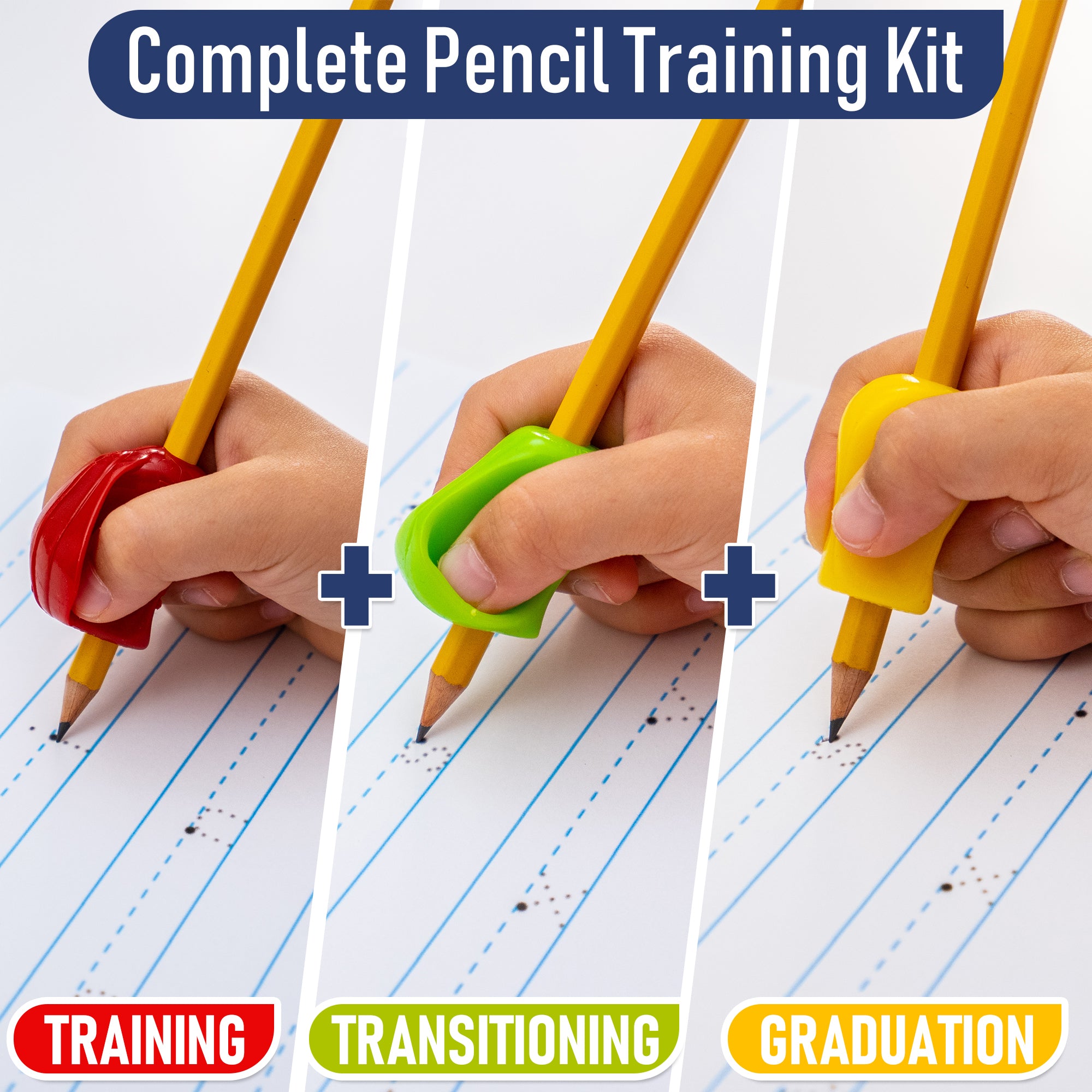- Pencil Training Kit: This package includes three premium pencil grips; The Crossover Grip, The Pinch Grip and The Pencil Grip; Follow the training process with these ergonomic pencil grips to achieve a lifetime of control and comfort
