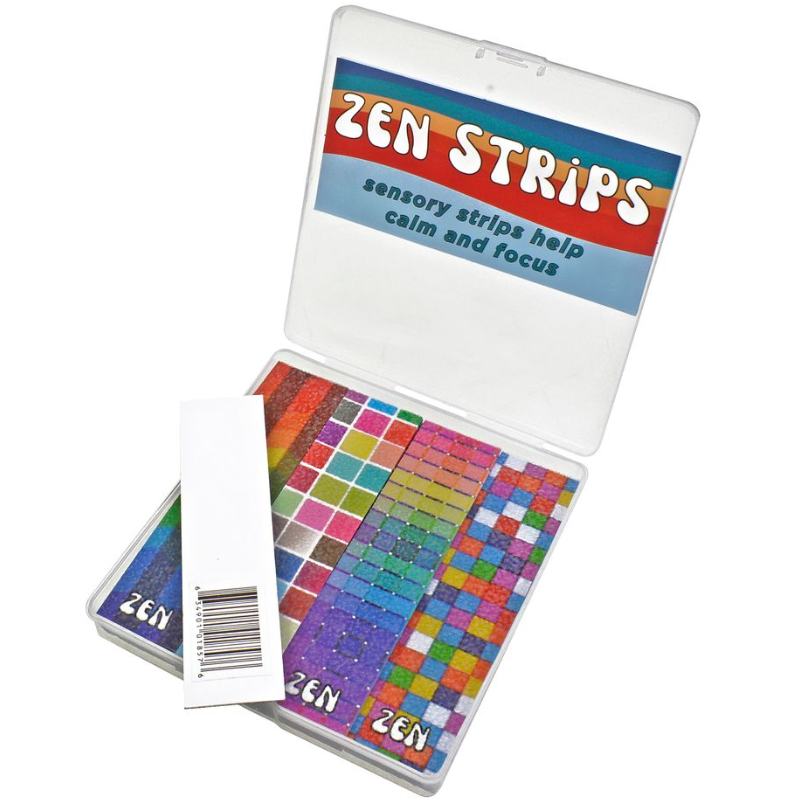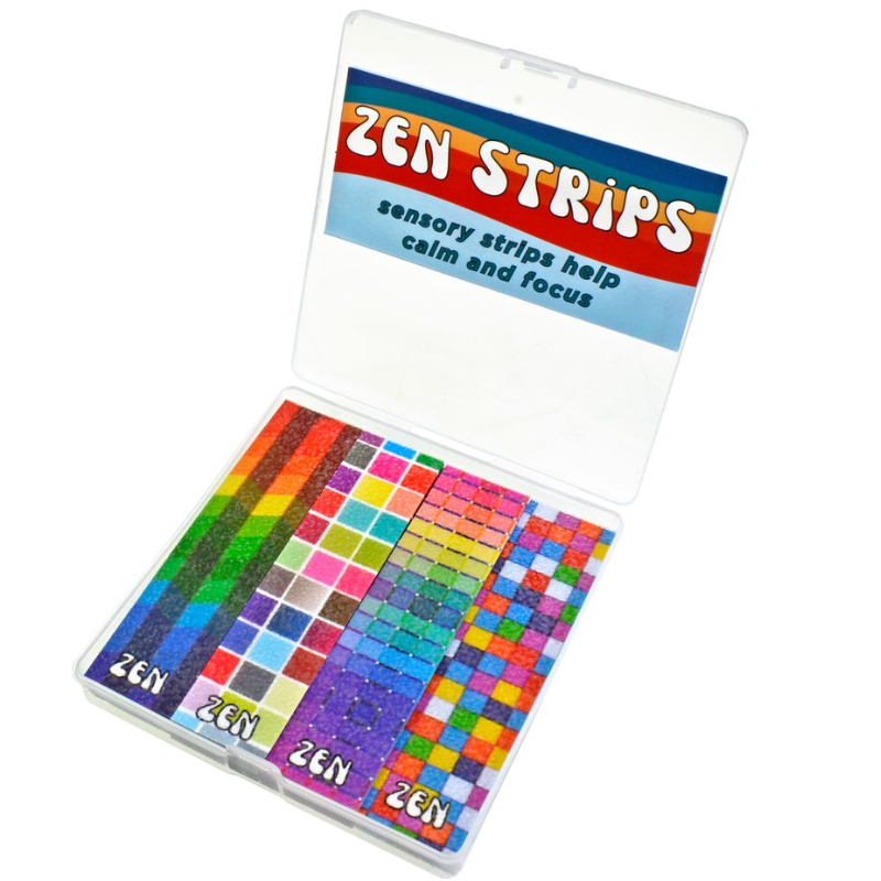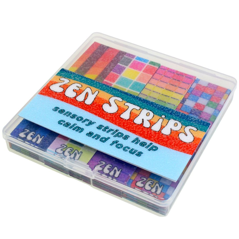 Sensory strips help calm and focus! Simply touch, swipe, scratch or fidget with Zen Strips to manage stress, boost concentration and enjoy a calming effect. With this 40-piece box, you get 10 times more strips than the individual packs! Sandy Brights Zen have a raised, grainy texture featuring 4 different rainbow designs.