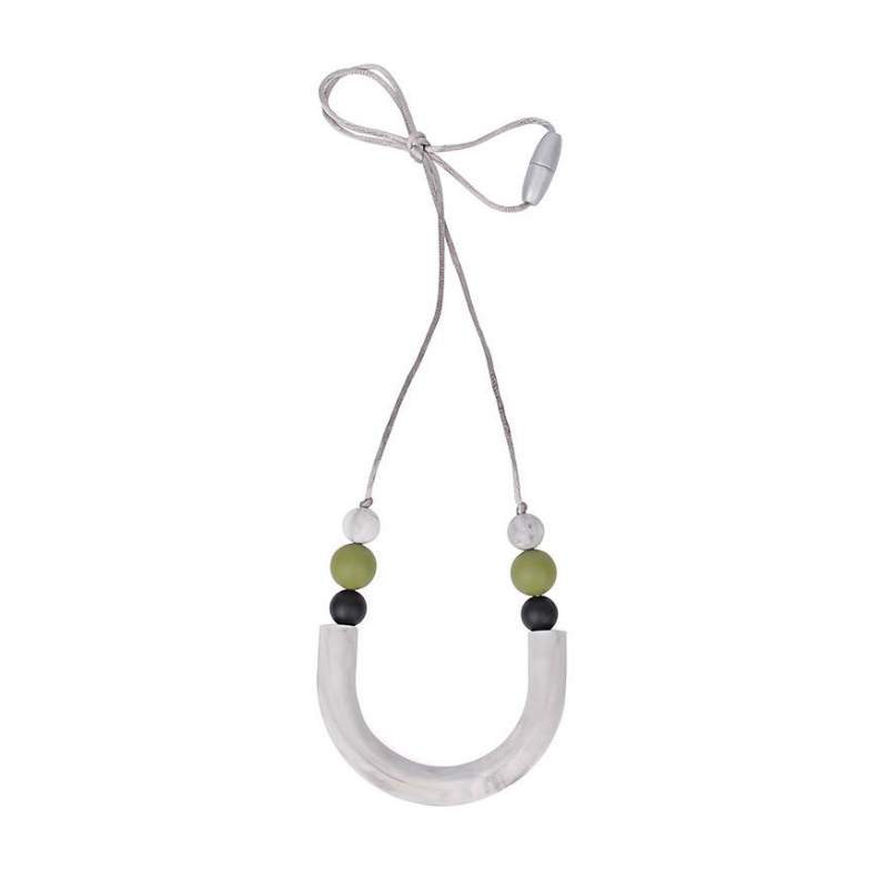This necklace is made to keep mom stylish while comforting baby with it's olive green and black accents and marble U